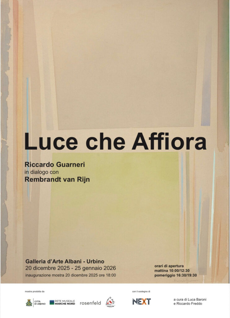 URBINO –Il Comune di Urbino presenta alla Galleria d’Arte Albani, dal 20 dicembre 2025 al 25 gennaio 2026, la mostra Luce che affiora. Riccardo Guarneri in dialogo con Rembrandt, un progetto espositivo che unisce le opere del grande artista italiano contemporaneo Riccardo Guarneri a una selezione di incisioni originali di Rembrandt van Rijn, maestro assoluto della luce e del chiaroscuro nella storia dell’arte europea.L’esposizione, curata da Riccardo Freddo e Luca Baroni, nasce dalla collaborazione fra il Comune di Urbino, la Rete Museale Marche Nord, la Gallery Rosenfeld di Londra e l’associazione L’Arte in Arte.