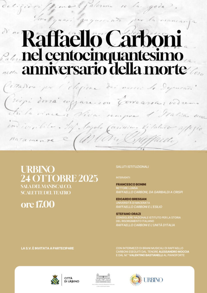 La città di Urbino celebra Raffaello Carboni (1817–1875) in occasione del 150° anniversario della morte. Il Comune (Assessorato alla Cultura) e il Comitato di Pesaro e Urbino dell’Istituto per la Storia del Risorgimento Italiano organizzano un convegno per ricordare la figura dell’illustre urbinate, personaggio di primo piano nella storia culturale e politica dell’Ottocento australiano.
